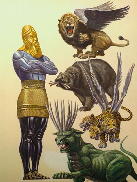 다니엘 7장에 나오는 네 짐승(다니엘 7:3~8, 16~27) 중에 바벨론은 사자(אַרְיֵה aryeh 아르예)를 국가의 상징물로 사용하였다. 2400년이 지난 지금도 바벨론의 성벽에는 사자가 조각되어 있으며, 거대한 돌사자가 앉아 있는 모양을 볼 수 있다. 다니엘 2장에서, 바벨론이 모든 금속 중의 왕인 금으로 표상되었던 것처럼, 7장에서는 바벨론이 모든 동물들의 왕인 사자와 모든 새들의 왕인 독수리(사탄 루시퍼가 죽음에서 부활하는 불사조로 등장)로 상징되었다.